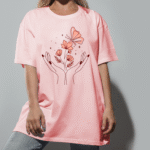 Elevate your style with the “Flower Pink” T-shirt, a piece that beautifully blends natural elegance with modern design. This soft, pink tee is crafted from 100% Cotton, ensuring a comfortable and breathable feel for all-day wear. The front features a unique, delicate line-art graphic of hands holding flowers and a butterfly, adding a touch of serene artistry to your look. With its classic regular fit, round collar, and standard length, this versatile t-shirt is perfect for any casual occasion. Designed and made in India, it’s a high-quality addition to your wardrobe that offers both style and comfort.