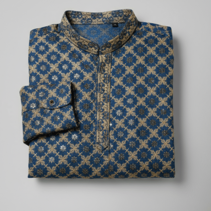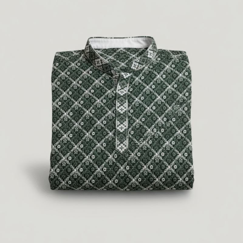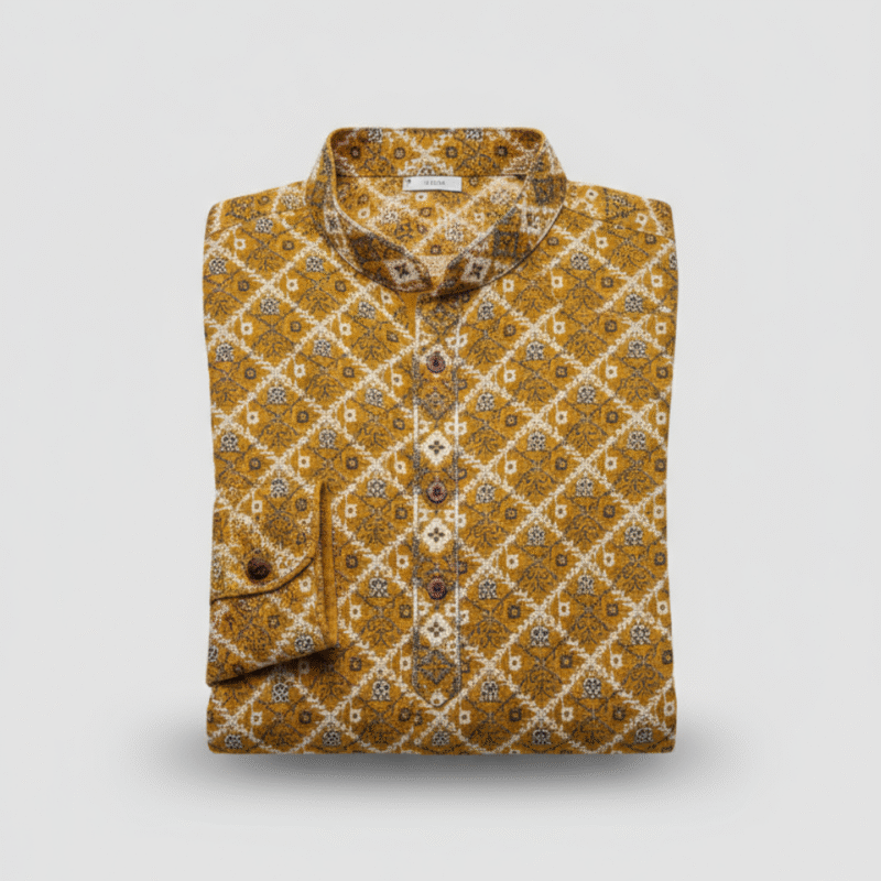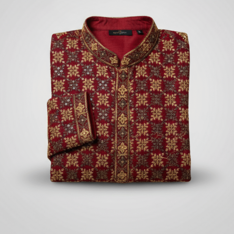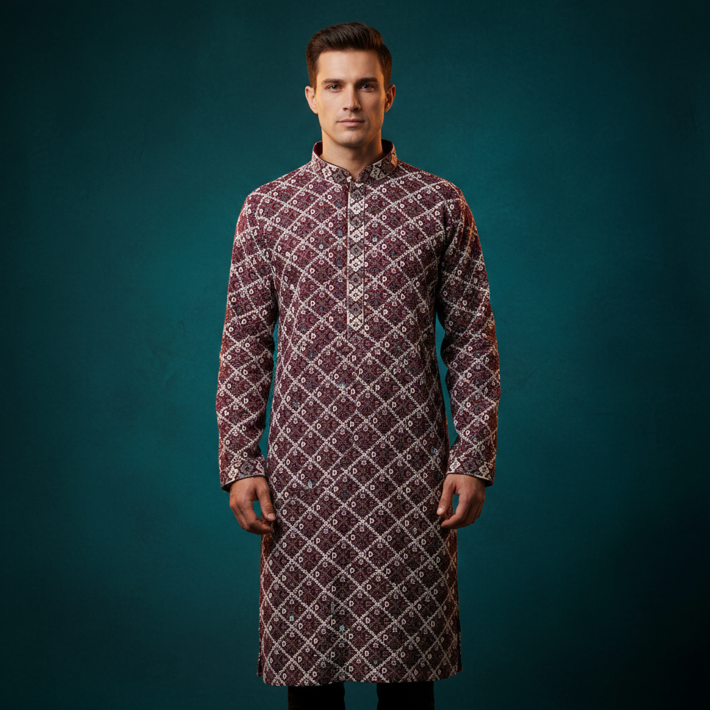 The Mehervaari Kurta beautifully embodies a blend of tradition and modern elegance. Crafted with a rich maroon and white geometric Jaipuri print, this kurta is an exquisite choice for ethnic celebrations and festive occasions. Made from high-quality breathable cotton, it offers both comfort and style for extended wear. The kurta features a classic band collar, a neatly designed button placket, and long sleeves with printed cuffs, creating a look that is both refined and culturally rich. Perfect for weddings, religious functions, or casual ethnic gatherings, the Mehervaari Kurta invites admiration with its understated yet sophisticated charm.